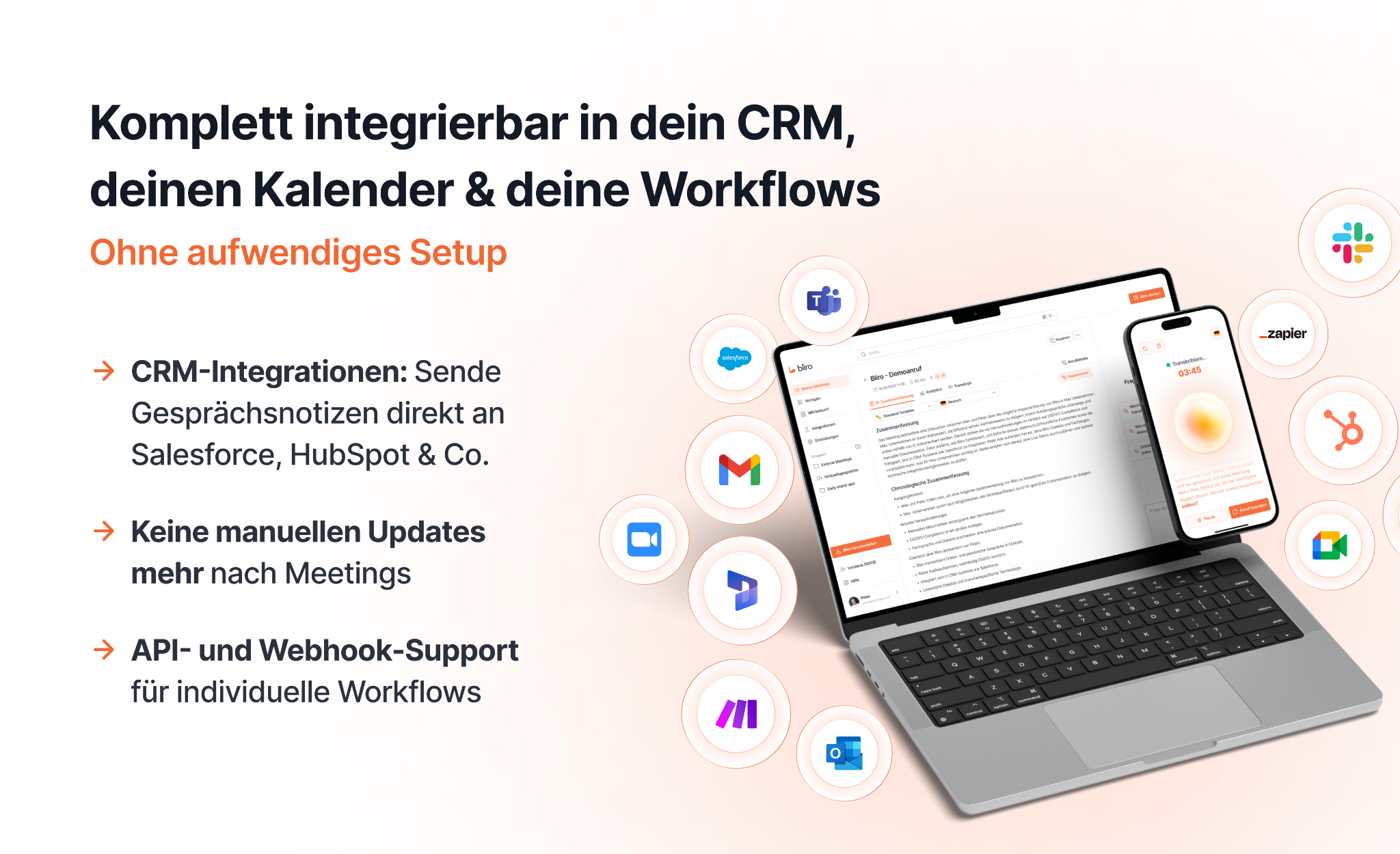 Die Verbindung zu Salesforce, HubSpot und anderen CRM-Systemen entscheidet über den praktischen Nutzen. Moderne Tools wie Bliro synchronisieren Gesprächsinhalte automatisch mit Kundenkontakten und befüllen relevante Felder ohne manuellen Aufwand.