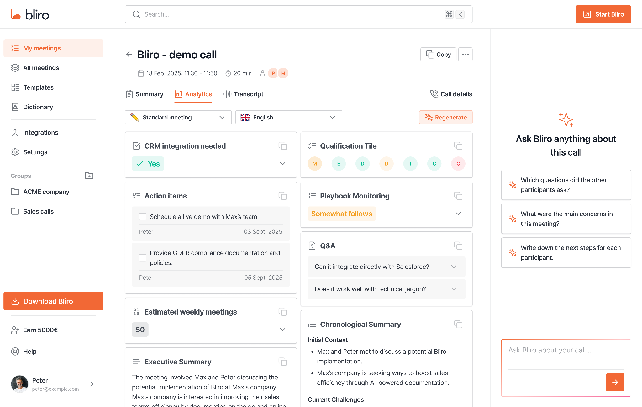 Bliro nutzt diese Möglichkeiten durch Vertriebsinteraktions-Analyse und kontinuierliche KI-Coaching-Funktionen. Vertriebsleiter werten Meetings präzise aus, stellen gezielte Fragen zu Teamgesprächen und decken Blockaden oder Leistungsprobleme auf.
