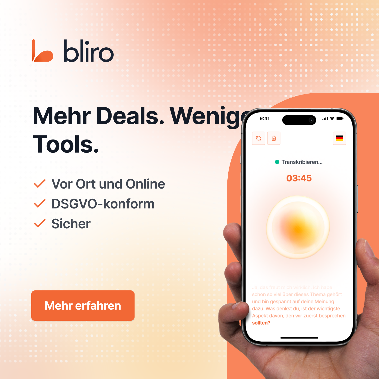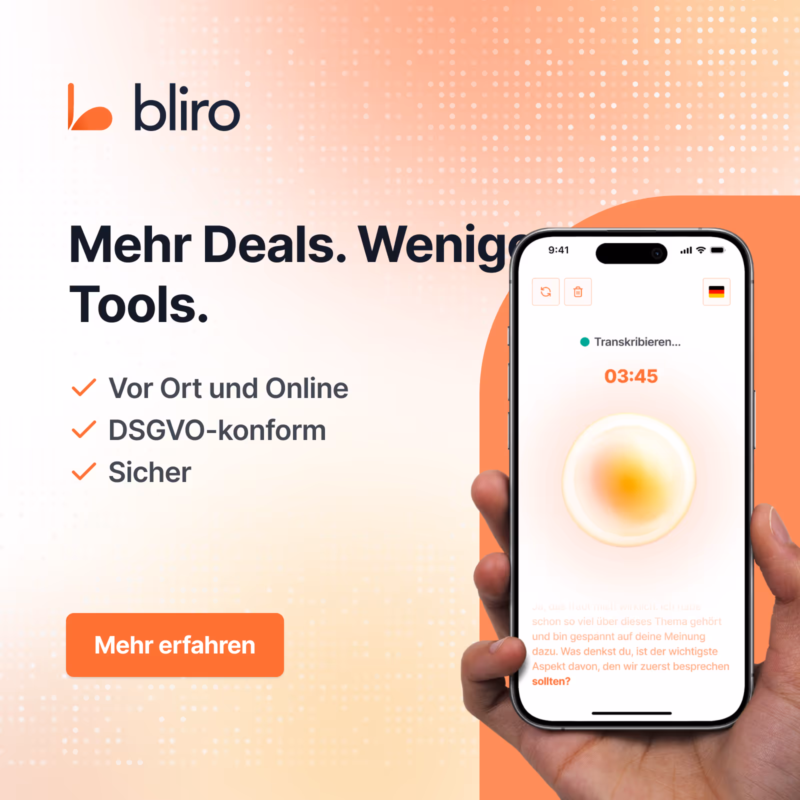 Moderne Technologien haben die Vertriebsgebietsplanung grundlegend verändert. Geomarketing-Software und digitale Karten bieten dir heute die Möglichkeit, deine Gebietsstrukturen datenbasiert zu optimieren. Bliro unterstützt dich dabei, wertvolle Zeit zu sparen und fundierte Entscheidungen zu treffen. Durch die Gesprächserfassung und -Analyse schafft das Tool wöchentlich bis zu 8 Stunden mehr Zeit für das Wesentliche - den aktiven Verkauf.