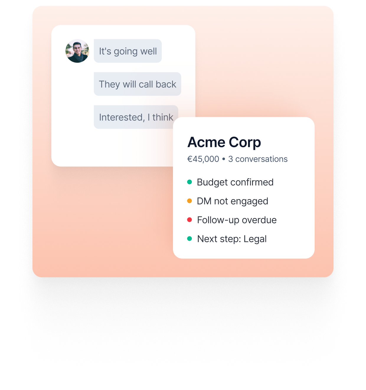 Montag, Pipeline Review. Du gehst die Deals durch und fragst: 'Wie steht's bei Kunde X?' Dein Rep sagt: 'Läuft gut, die sind interessiert.' Aber was heißt das? Du weißt es nicht, weil du nicht im Meeting warst. Im CRM steht ein Satz - wenn überhaupt. Du versuchst, einen Forecast zu bauen, aber deine Datenbasis ist das, was 15 Reps sich gemerkt haben.