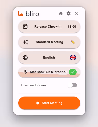 A special update for our Mac users: Bliro now uses the Mac Screen Capture Kit for audio transcription with the new release. You only need to set the headphone toggle in the home screen correctly. All other audio settings are now handled automatically by Bliro.